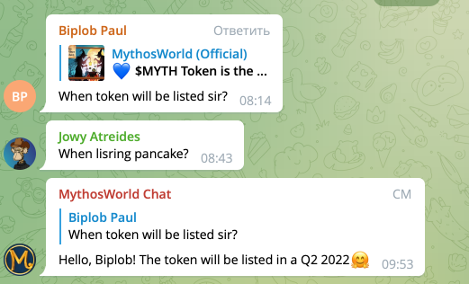 Social monitoring was one of the key activities. The service monitors the web, specifically the most prominent social media channels like Reddit and Twitter. Analyze online brand image and sentiment about the project. Once we found questions or comments relevant to MythosWorld or another play to earn topics, we commented in that thread.