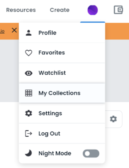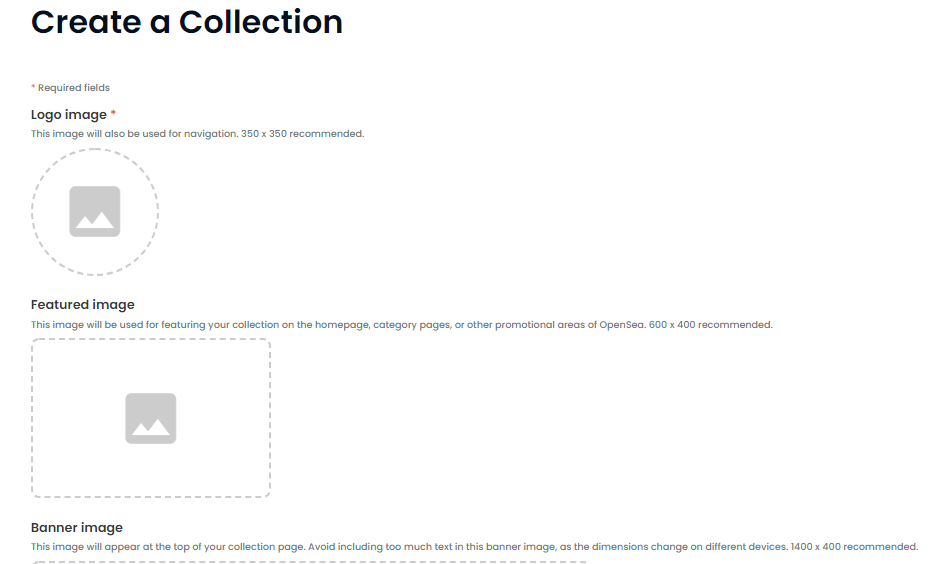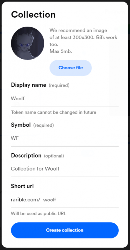 Klicken Sie auf Meine Sammlungen, um eine Benutzeroberfläche mit einer Schaltfläche zum Erstellen einer NFT-Sammlung zu öffnen. Klicken Sie auf diese Schaltfläche und passen Sie die Einstellungen an.