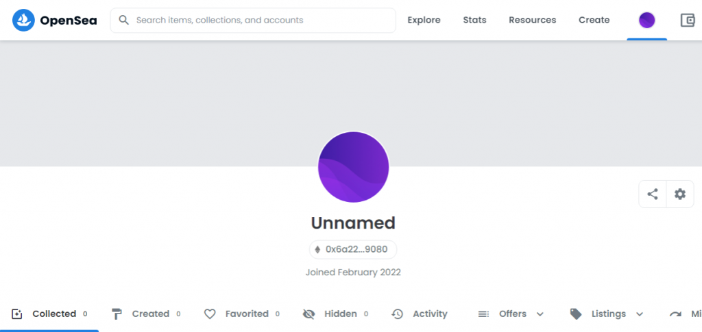 Jetzt haben Sie ein Konto auf einem NFT-Marktplatz registriert und können ein Profilsymbol in der oberen rechten Ecke sehen.