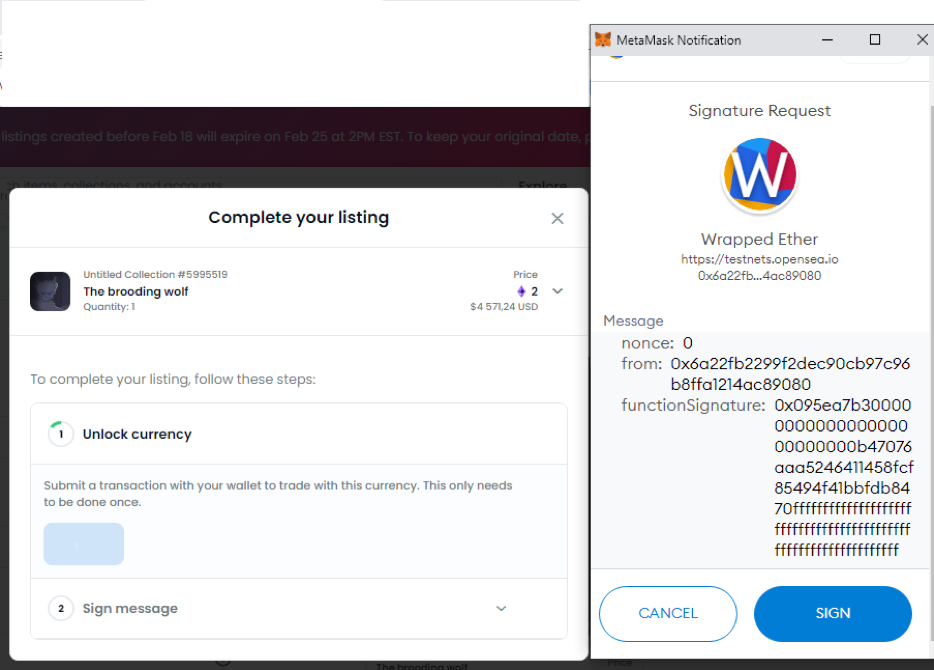 Sie können Ihr Token auch hier bearbeiten oder mit einem NFT-Verkauf fortfahren. Klicken Sie auf Verkaufen und verknüpfen Sie den Artikel mit einer bestimmten Blockchain in Ihrer Krypto-Geldbörse. Alle Daten werden automatisch bereitgestellt: Sie müssen nur die Verbindung bestätigen.