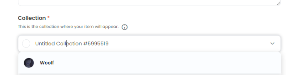 Für das erste NFT ist es besser, einen Preis und keine zeitgesteuerte Auktion zu wählen. Wählen Sie die Kollektion aus - entweder die standardmäßig angebotene oder Ihre eigene.