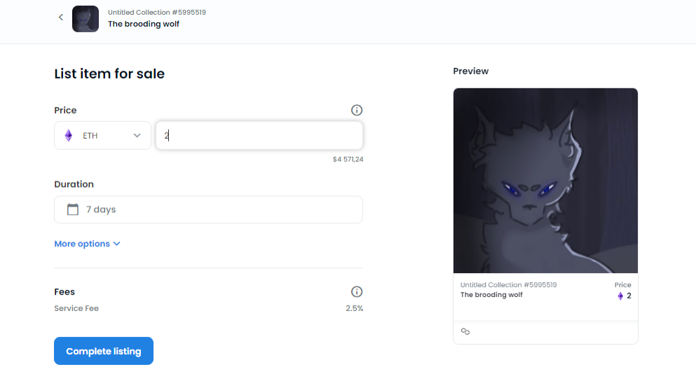 Wählen Sie einen Festpreis aus. Beachten Sie, dass der NFT-Marktplatz eine Gebühr von 2,5% auf alle NFT-Verkäufe erhebt.