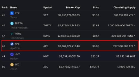 Bien que le jeton APE n’ait été lancé que récemment, avec la sortie officielle en avril 2022, il est immédiatement entré dans le top 50 des jetons par capitalisation et est devenu l’un des plus grands jetons de la DAO. Aujourd’hui, l’Apecoin est le deuxième jeton DAO en termes de capitalisation.