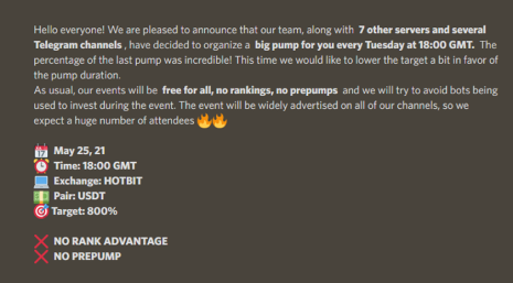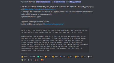 Grâce à cette structure, les serveurs discord permettent aux membres de communiquer sur différents canaux en fonction de leurs centres d’intérêt. Quelqu’un choisit la formation et quelqu’un discute des signaux. Sur certains canaux, des traders expérimentés envoient des signaux et organisent des transactions conjointes afin d’influencer le prix de la crypto-monnaie.