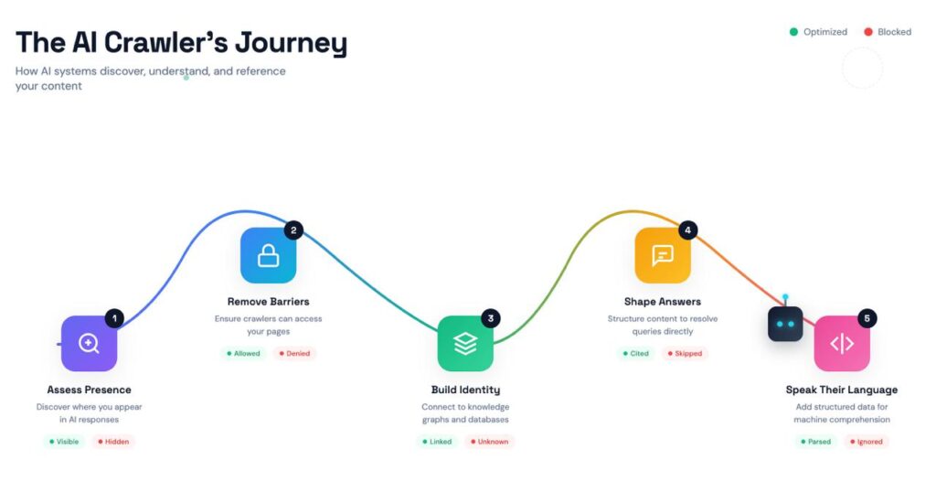 La figura sottostante illustra come un crawler dell’intelligenza artificiale naviga nel tuo sito web: dalla prima scoperta della tua esistenza nelle sue risposte, fino alla comprensione dei tuoi dati strutturati. Immagina un viaggio con cinque punti di controllo. A ogni fermata, il crawler avanza (sei ottimizzato) o si scontra con un muro (sei invisibile). Utilizza questa tabella di marcia per seguire le fasi successive.