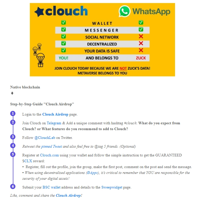 Airdrop of Clouch on SweepWidget. Take a look at all rules that users had to follow