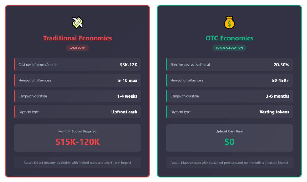 As campanhas tradicionais de KOL custam entre $3.000 e $12.000+ mensais por influenciador em dinheiro. As ofertas de tokens OTC usam a alocação de tokens, reduzindo significativamente a queima de dinheiro inicial.