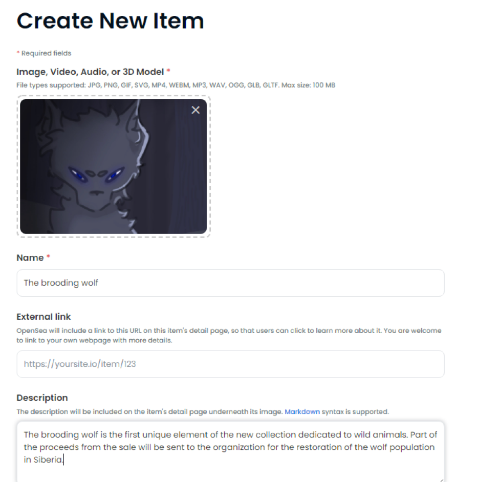 Depois disso, deves carregar uma imagem ou outro ativo digital único, introduzir o nome e a descrição, ajustar as definições (que são basicamente as mesmas que no OpenSea, como o conteúdo desbloqueável) e especificar a percentagem de royalties para revenda. Clica em Criar itens. Criaste um token com sucesso.