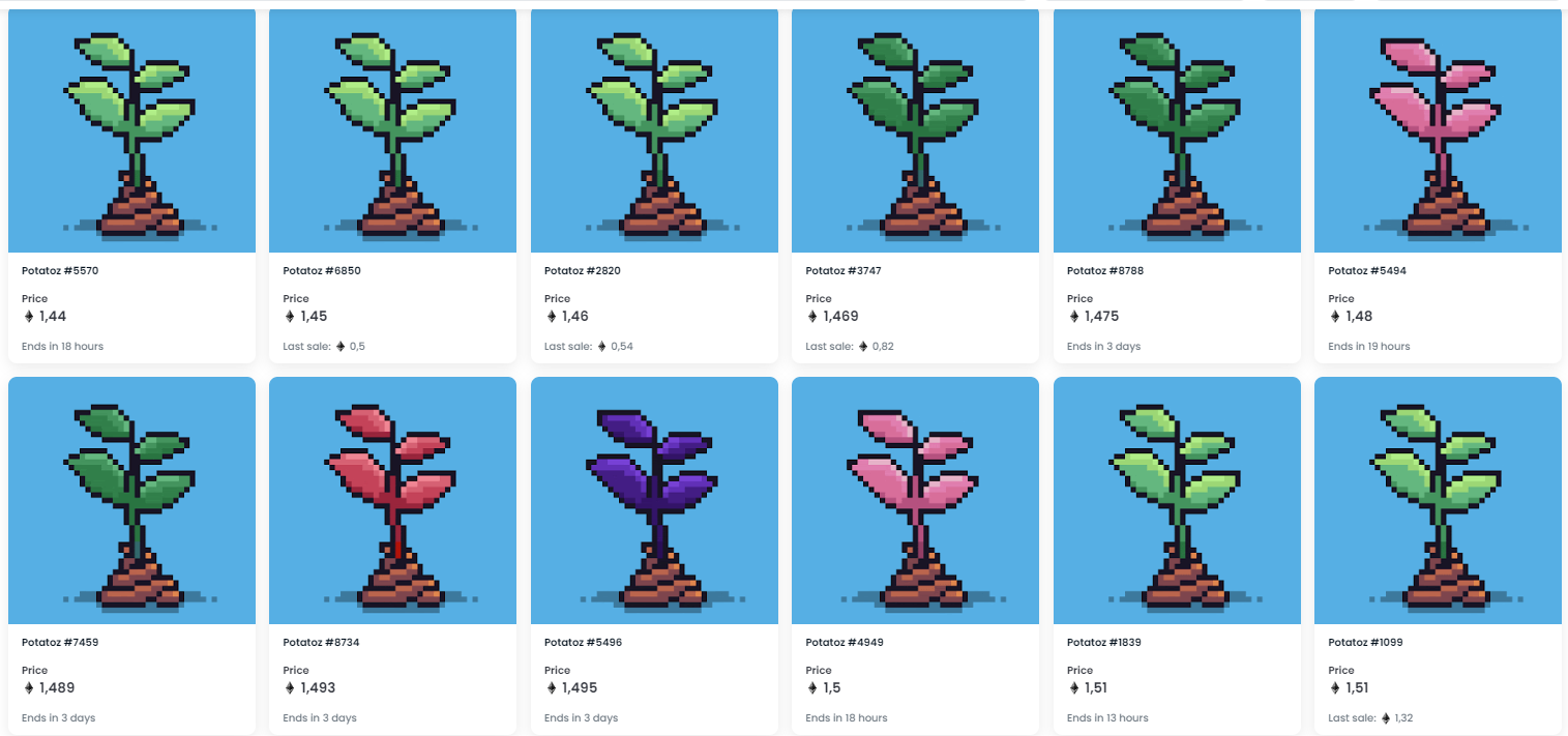 На OpenSea самыми продаваемыми NFT-коллекциями были BAYC, CryptoPunk (с ними мы уже знакомы) и The Potatoz (элементы виртуального мира Memeland):