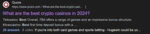 This campaign aimed to increase brand awareness and to get into the ratings of the best crypto casino companies by encompassing 20+ different keywords from all possible sources: PR articles, Quora, YouTube, Medium, and LinkedIn. For example, "top crypto casino," "best crypto casinos," "best crypto gambling platform," and "top gambling site" were among the keys that we had to cover.